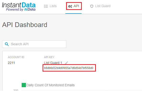 After logging into InstantData, click on the API tab, then find your List Guard API key.